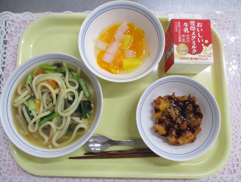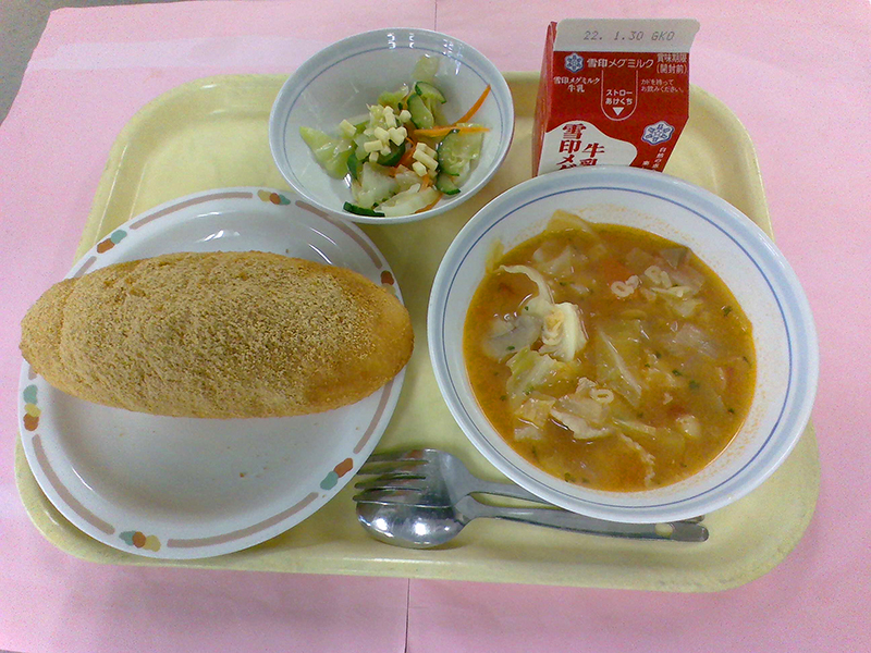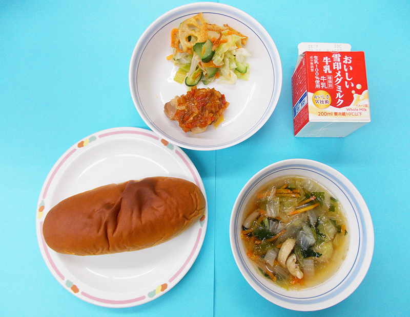 東邦大学と共同開発した献立の例(黒砂糖パン、チキンのサルサソース、れんこんチップサラダ、白菜と鶏肉のスープ、牛乳)