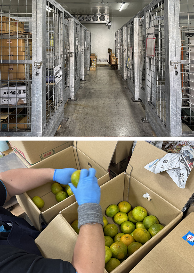 配送前のピッキング作業などが行われる倉庫の様子(神奈川県川崎市)。大型の冷蔵庫や冷凍庫(−20・37℃の2段階)を備え、品質の劣化を防いでいます(画像上)。みかんは、一つひとつ目視で検品されていました(画像下)