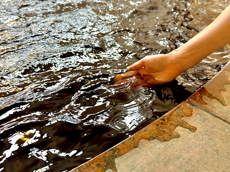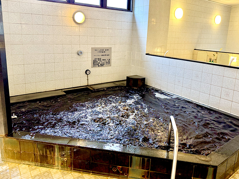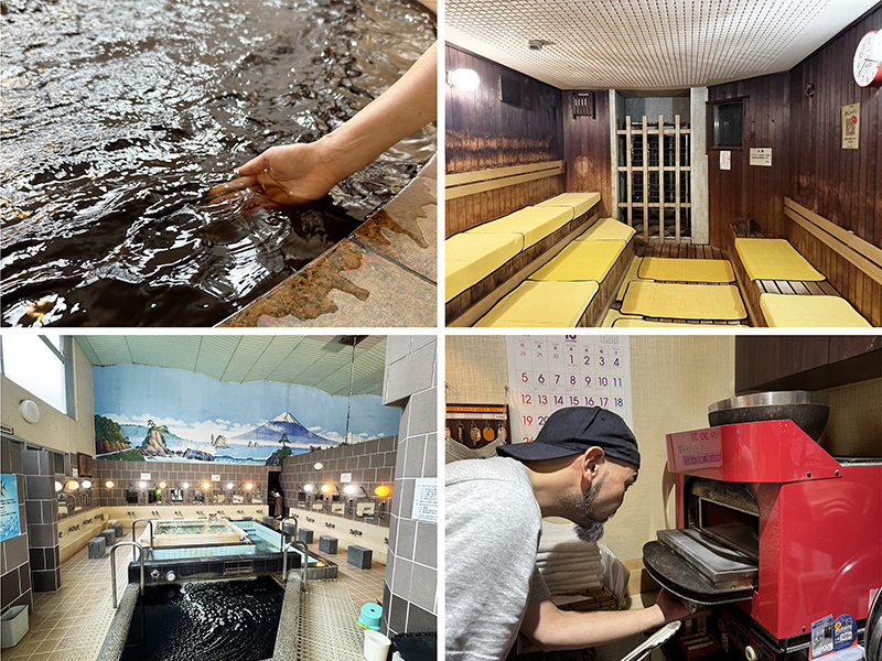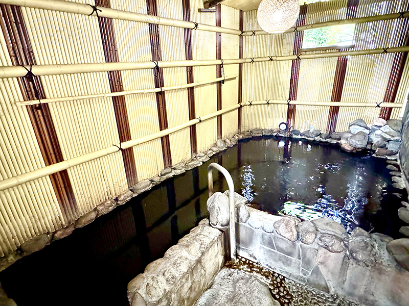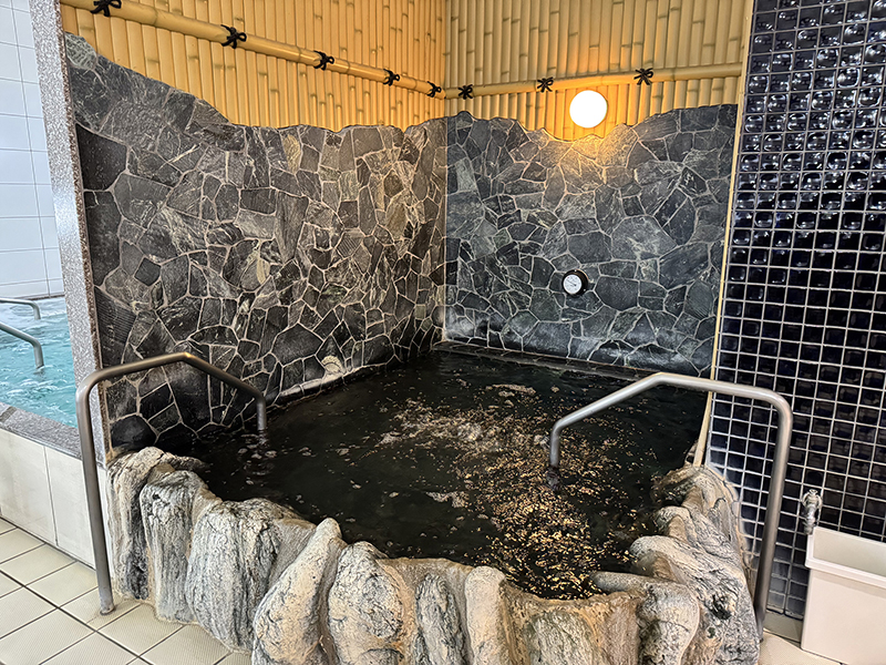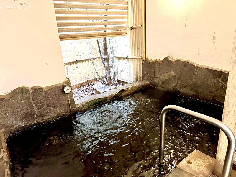 湯は源泉かけ流し黒湯(熱湯と水風呂)を備え、季節に合わせて湯温を微調整。