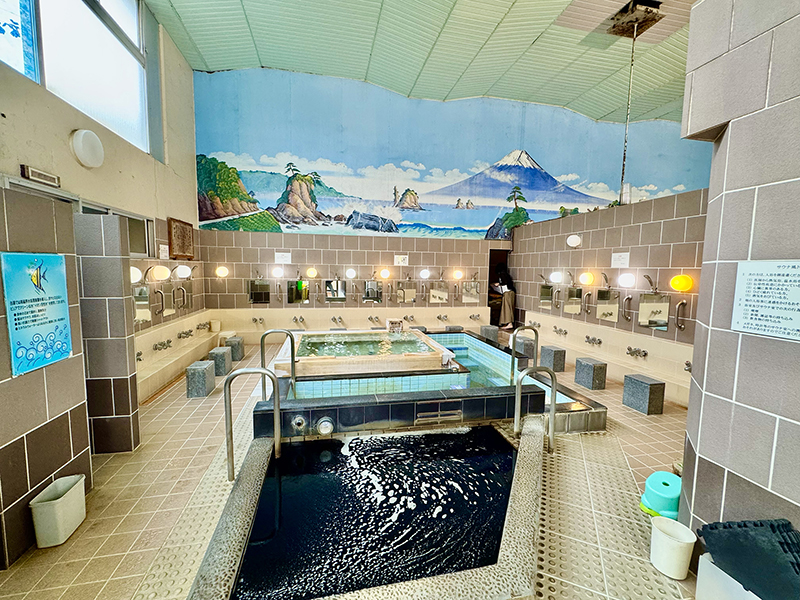 昔ながらの「富士山の壁画」が印象的な浴場。手前に写っているのが「黒湯」です
