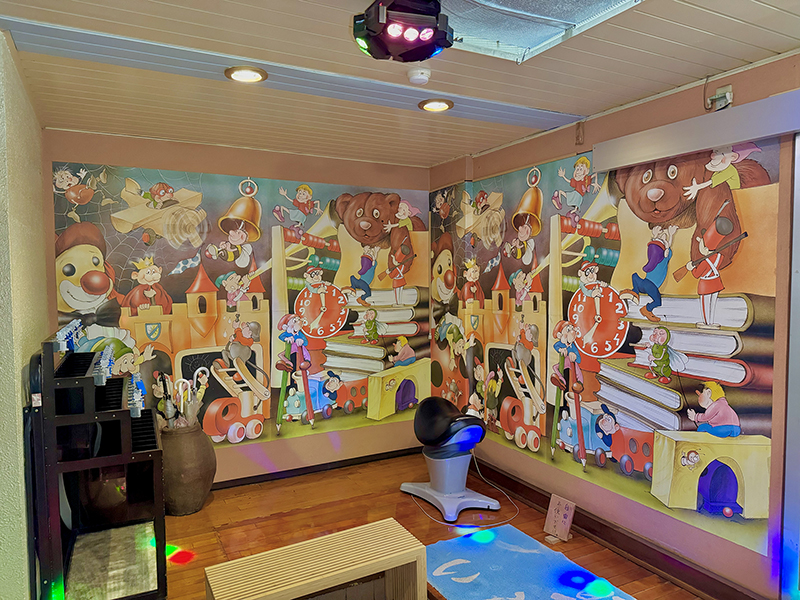 玄関のシンボルでもあるファンタジックな壁紙も見どころのひとつ。これも先代発案の工夫で、「こどもたちに楽しんでもらえる場所にしたい」という願いが込められているそう。