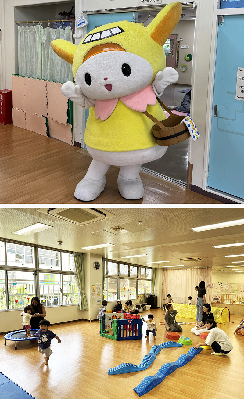 はねぴょん:大森東一丁目児童館の自慢は、なんといっても広ーい「遊戯室」! 体操タイムやアスレチックタイム、手遊びなど、赤ちゃんや幼児さん向けのプログラムが毎日行われているんだぴょん!