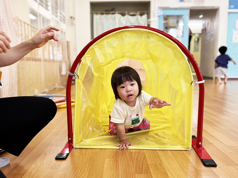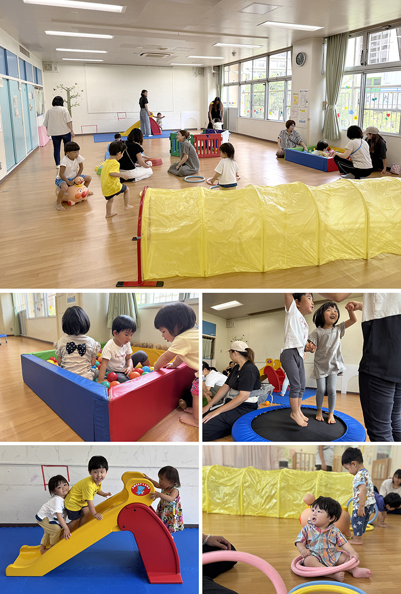 続いて始まった「アスレチックタイム」では、ボールプールや平均台などの大型遊具で元気いっぱい体を動かします。