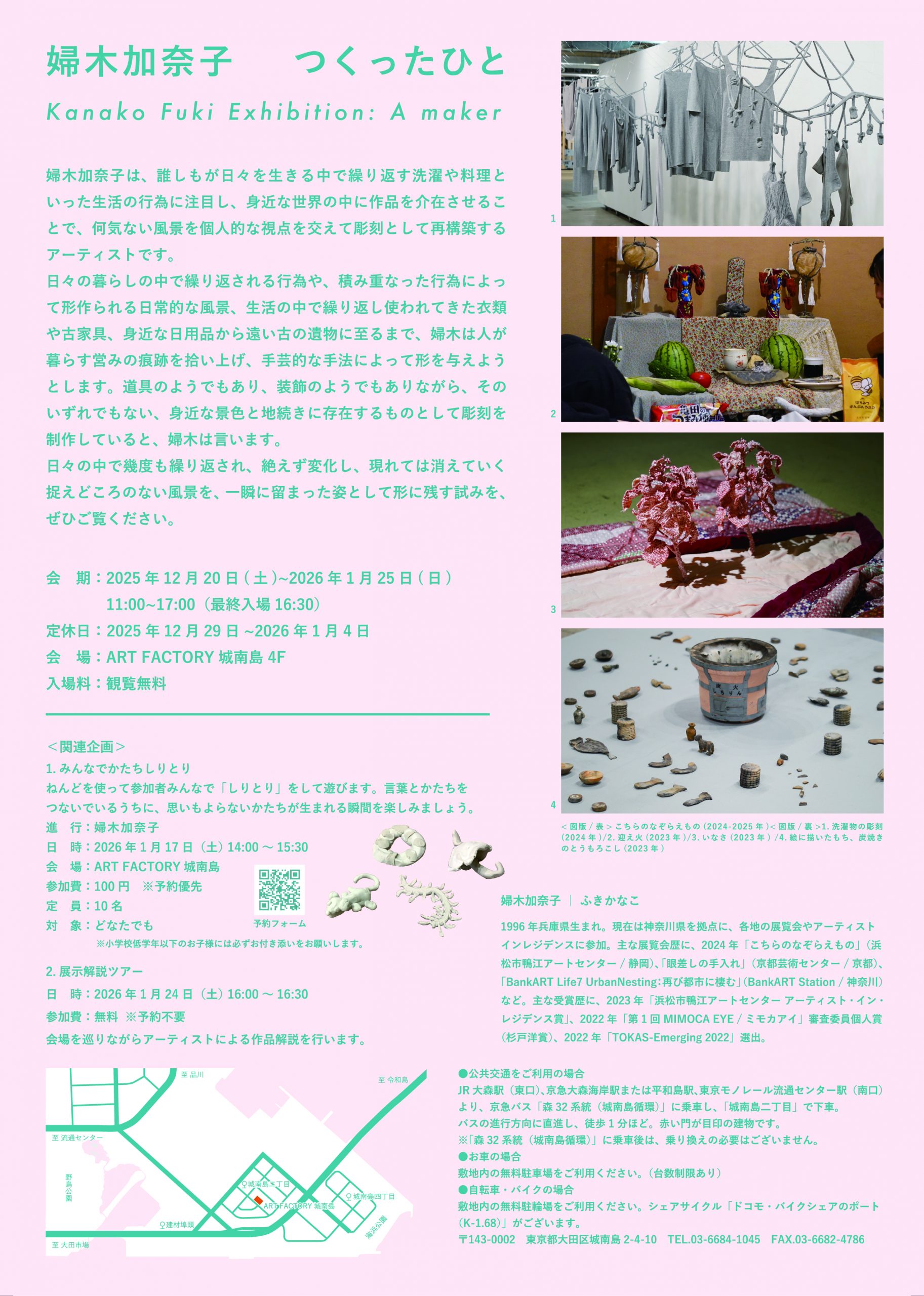 12月20日(土)~2026年1月25日(日)に婦木加奈子個展「つくったひと」をART FACTORY城南島4F多目的ホールにて開催します。