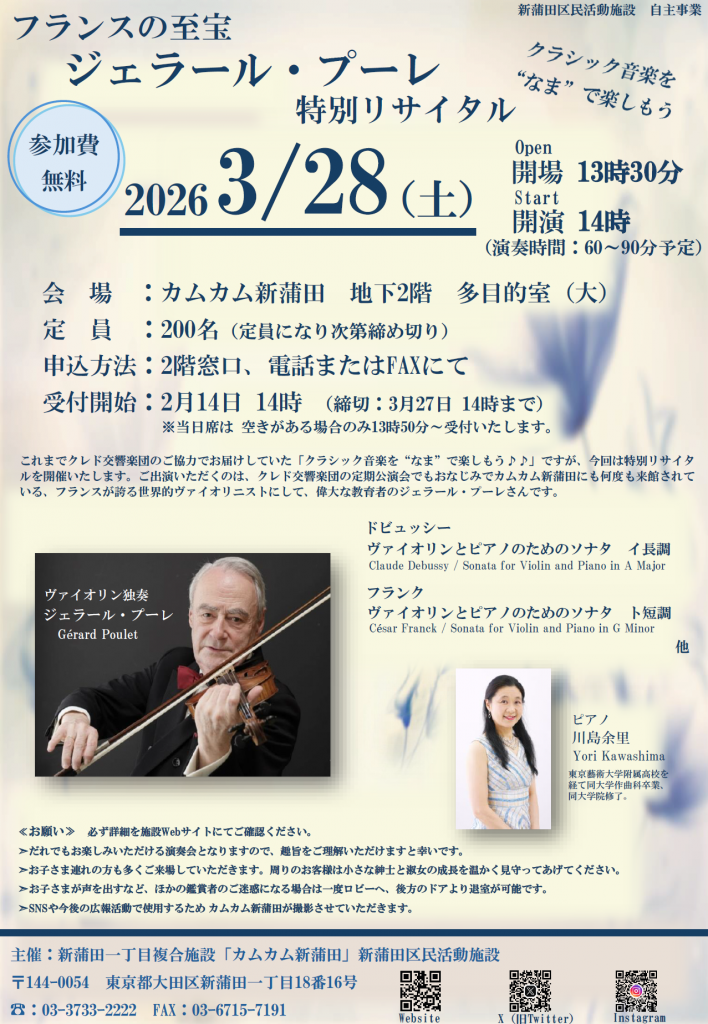 ご出演いただくのは、クレド交響楽団の定期公演会でもおなじみでカムカム新蒲田にも何度も来館されている、フランスが誇る世界的ヴァイオリニストにして、偉大な教育者のジェラール・プーレさんです。