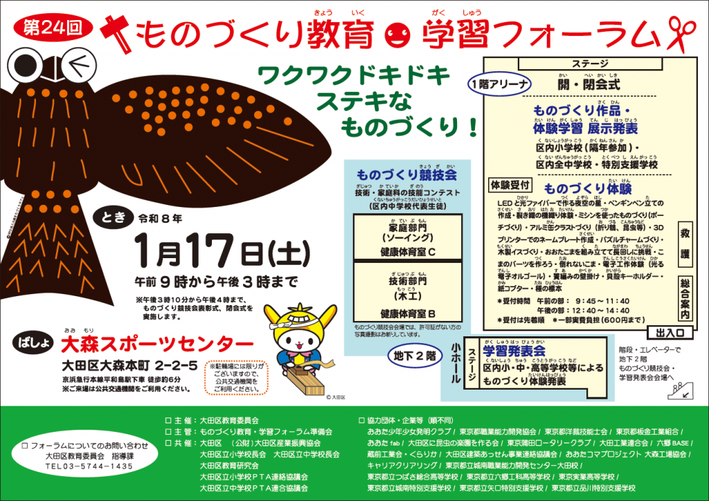 「ワクワク ドキドキ ステキなものづくり!」をコンセプトに「第24回ものづくり教育・学習フォーラム」を開催します! 最先端のSTEAM教育に取り組む区独自教科「おおたの未来づくり」の「ものづくり」や「地域の創生」の学習成果を、プレゼン・展示・販売を通して発表します。 地域の企業・団体によるものづくり体験コーナーや、中学生によるものづくりライブコンテストも行います。ぜひお越しください! ものづくり体験受付時間 午前の部 9:45~11:40 午後の部 12:40~14:40 受付は先着順 一部実費負担(600円まで) ※小学校1、2年生は、必ず保護者の方と一緒に会場に来てください。 ※御来場は公共交通機関を御利用ください。