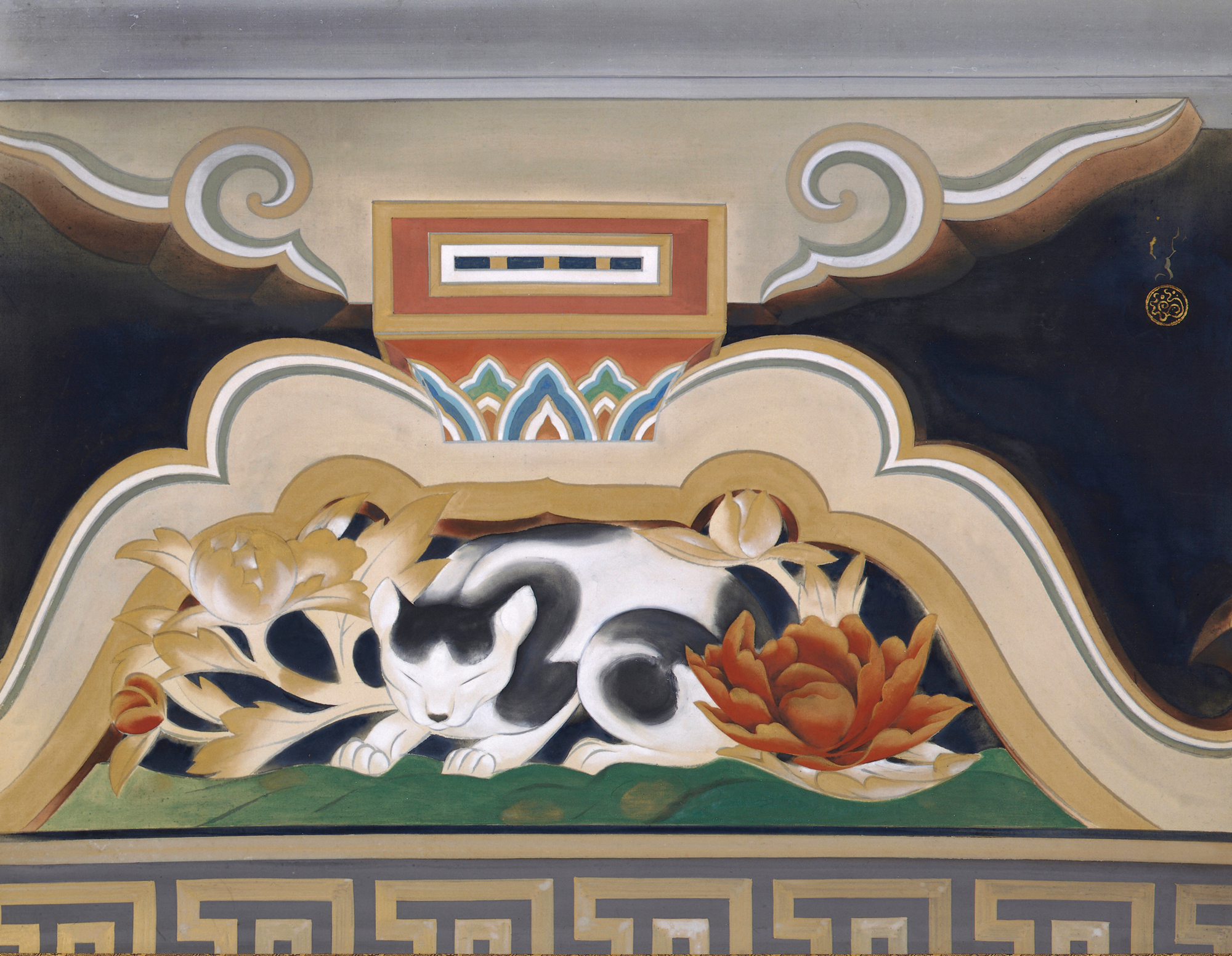 日光東照宮の木彫り像「眠猫」を描いた作品です。日光を訪れた龍子がこの彫刻を気に入ったため作成。龍子独自の色彩を用いて制作。