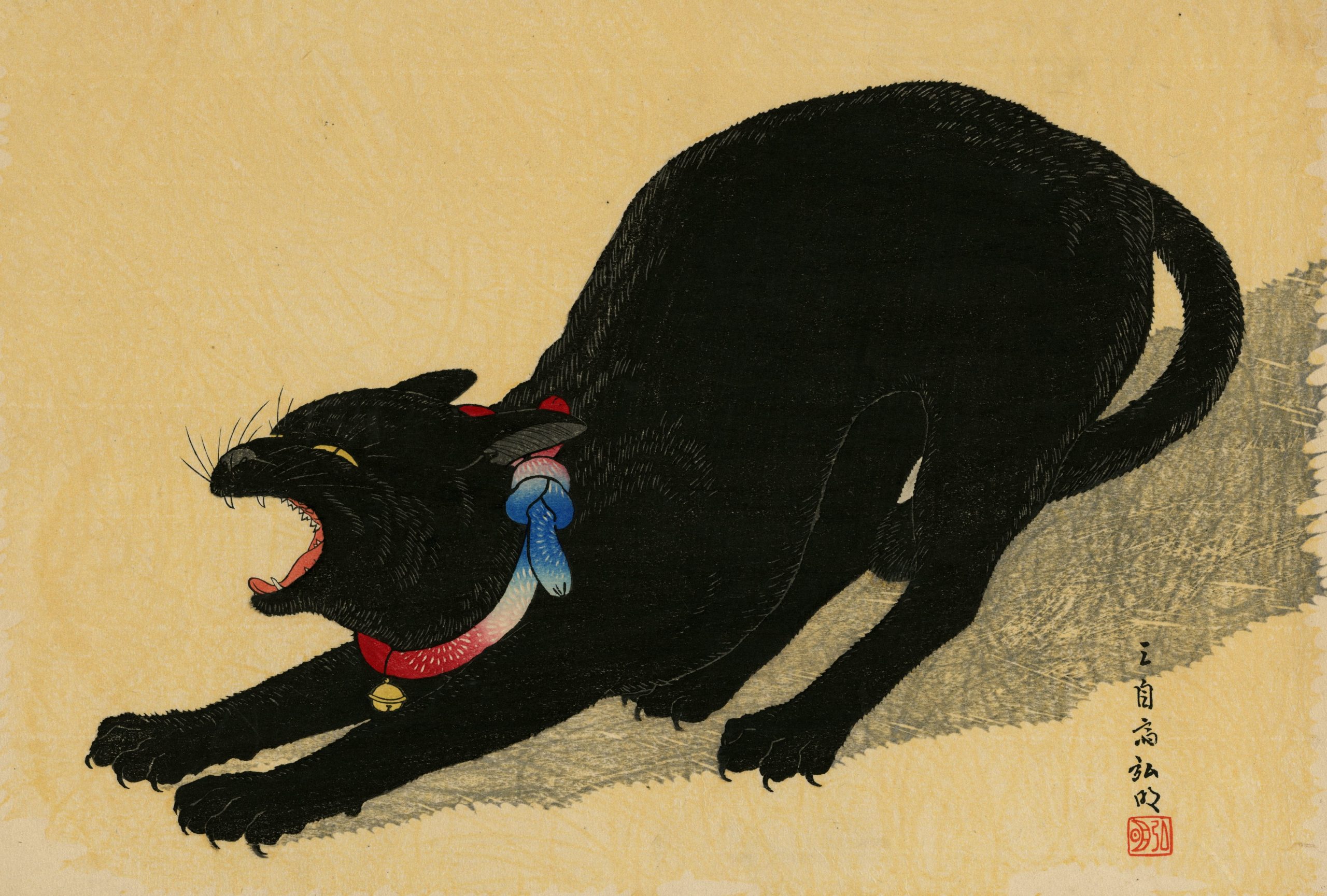 飼い猫を描いたと伝わる本作は、黒地に白の対比が鮮やかで、首輪の赤が効いた作品です。