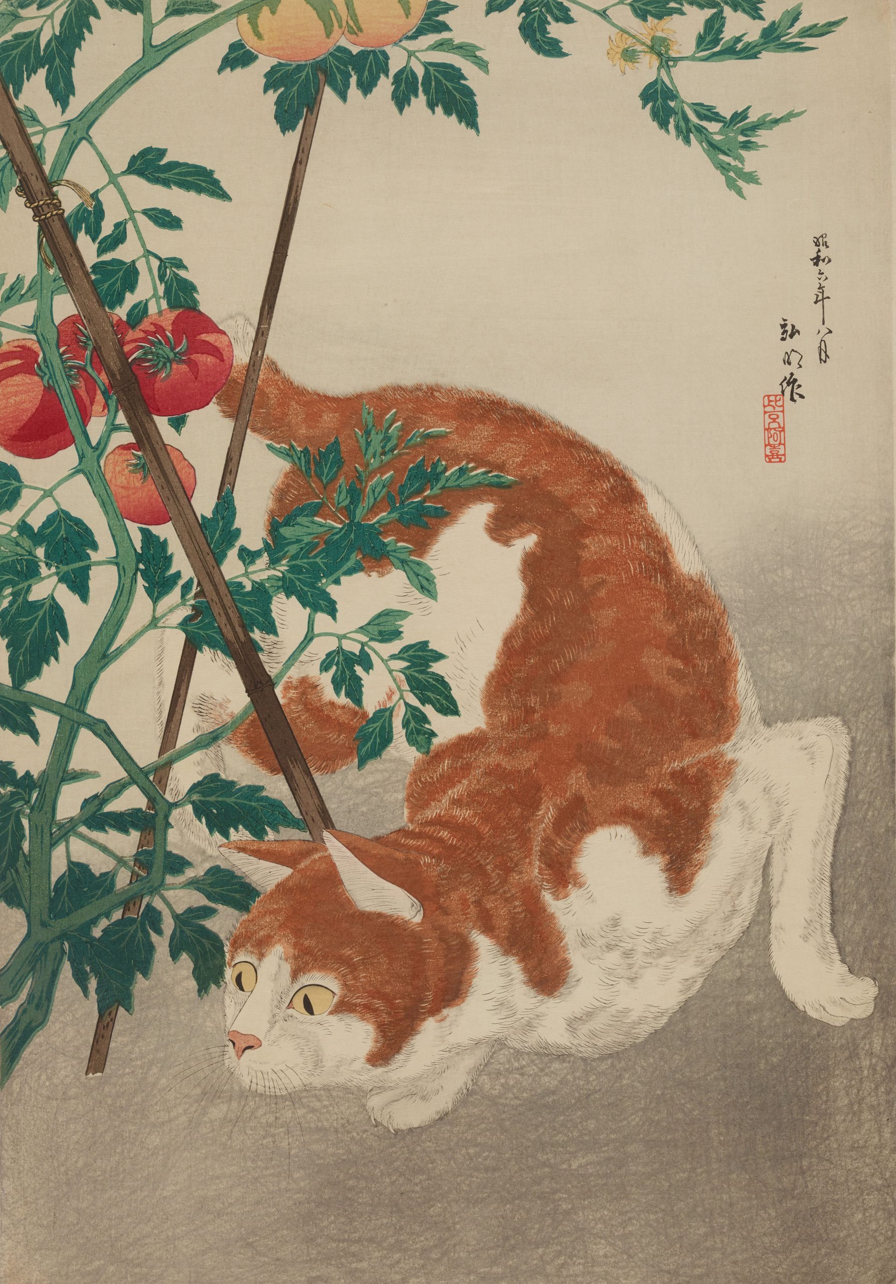 高橋松亭(弘明) 「トマトと猫(茶猫)」昭和6(1931)年8月 版元:孚水画房 個人蔵