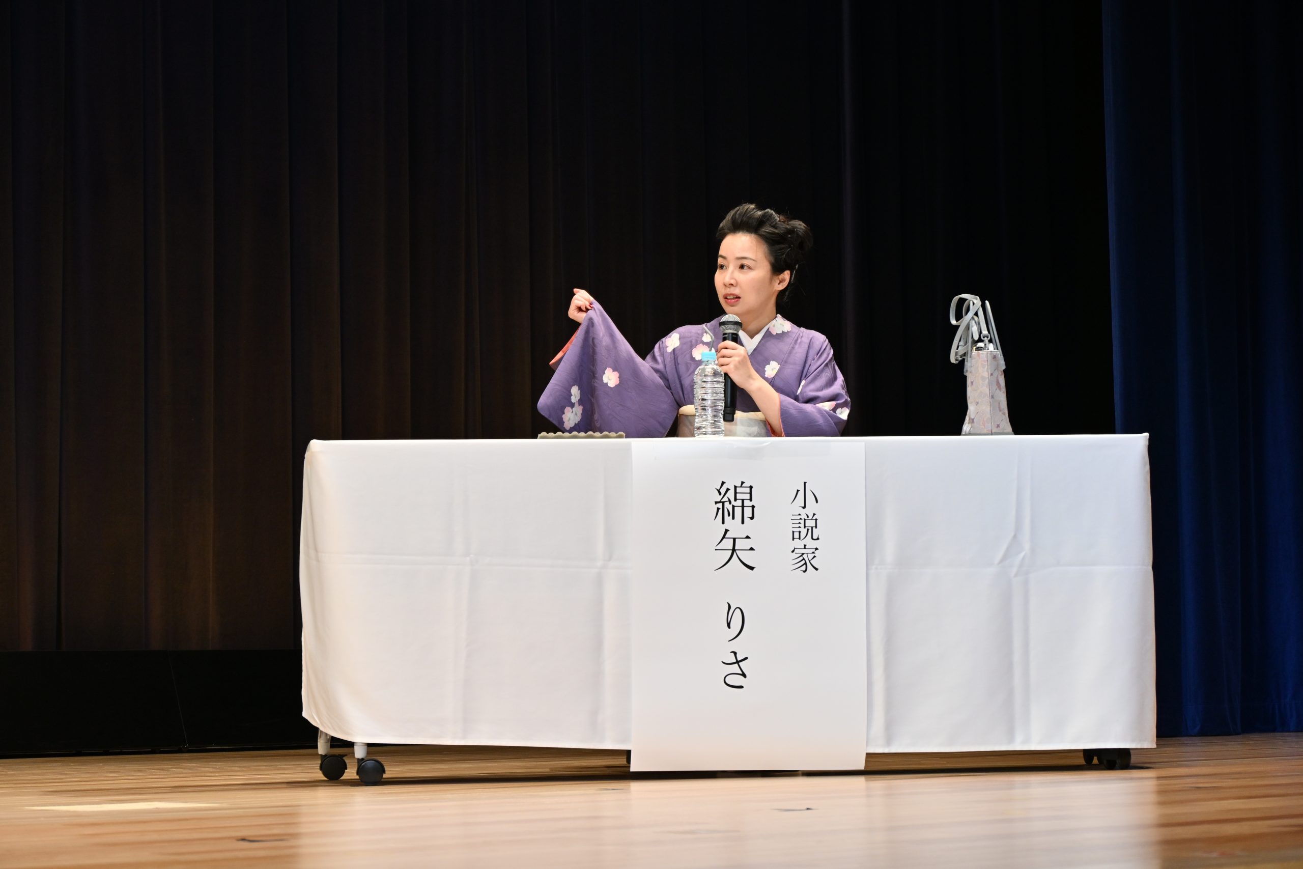 宇野千代デザインの着物で登壇した綿矢氏