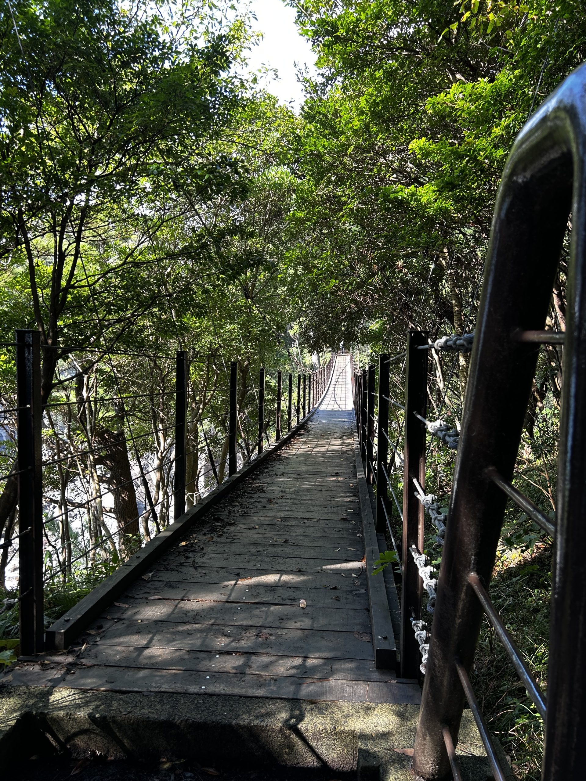学園の南門を出て、川沿いを海に向かって歩くと、自然豊かな木々に囲まれた遊歩道が目の前に広がり、森林浴を楽しみながら歩けます。10分ほどで、海に到着。さらに進むと見えてきました「橋立吊り橋」。私は吊り橋などというものが初めてだったので、足がすくみ、ゆっくりゆっくり慎重に前に。真ん中あたりにくると景色が開け、眼下に広がる広大な海が私を出迎えてくれました。少し歩くだけで橋が揺れるドキドキを感じながら、もう少しだけ絶景の中にいたいと心に誓ったが、やはり腰が引けて怖い。そそくさと後退してしまった。自然と調和したこの吊り橋の魅力を皆さんに伝えきれないのが残念ですが、これは行った方にしかその魅力は伝わらないですよ。ぜひぜひ一度訪れてみてください。