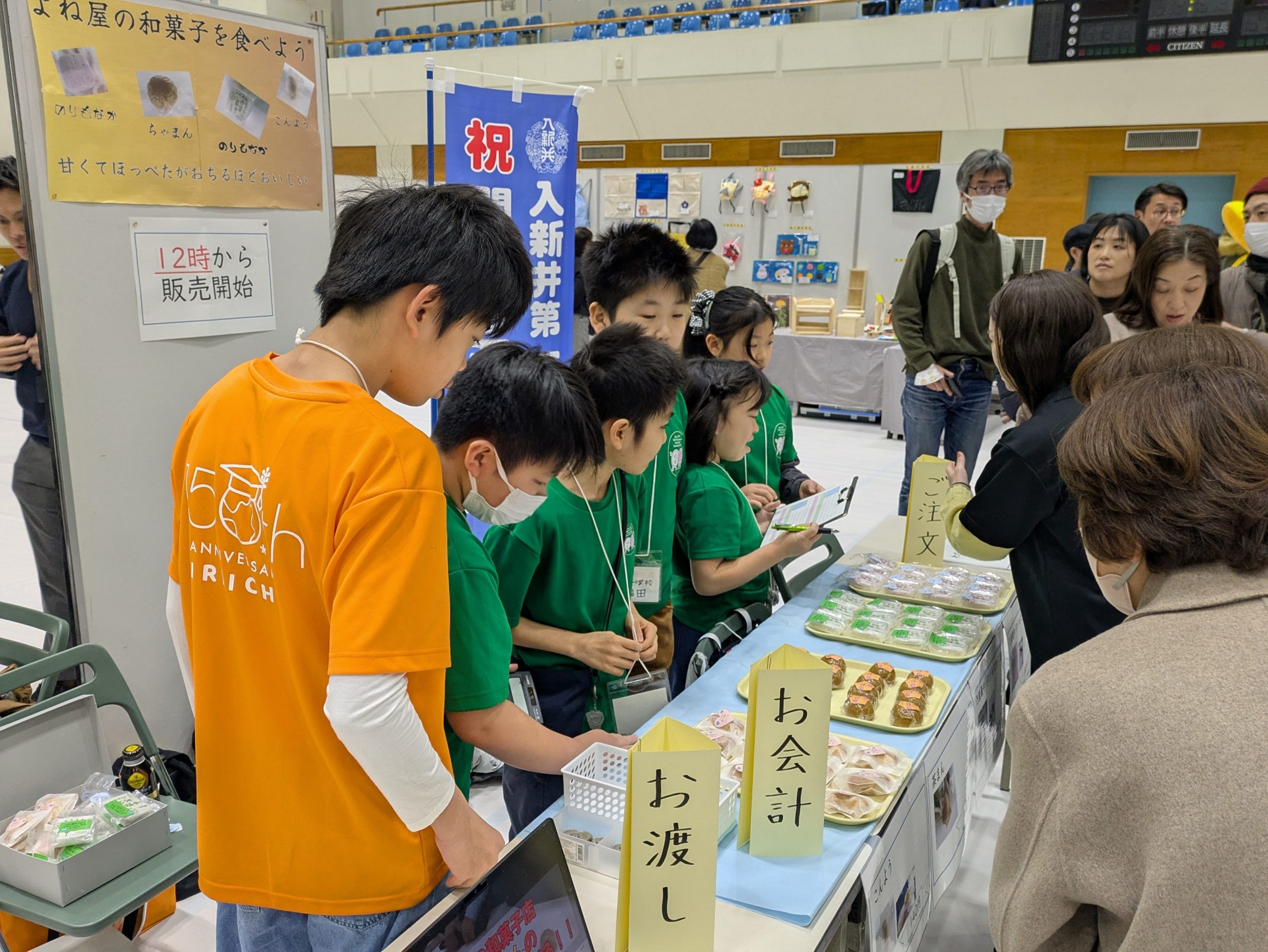 入新井第一小学校では、地元の「よね屋」さんの和菓子を販売しました。