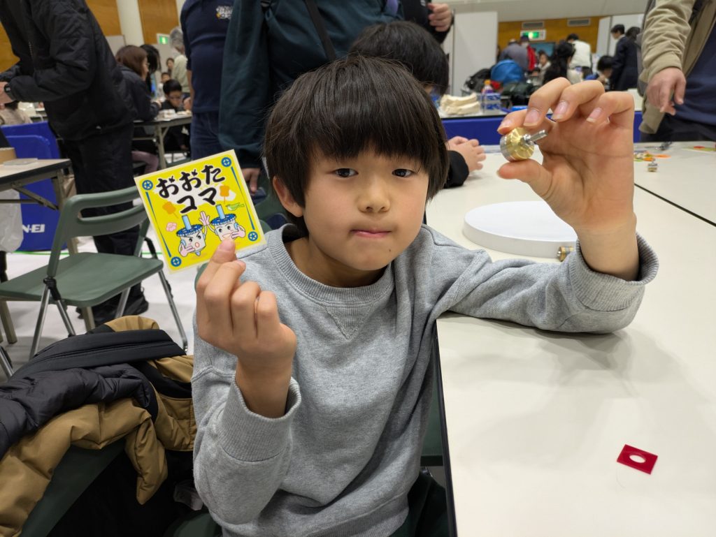 長回し競争で1位をとって、「おおたコマ」の特製シールをゲット!大好きなベイブレードで鍛えた成果かな?