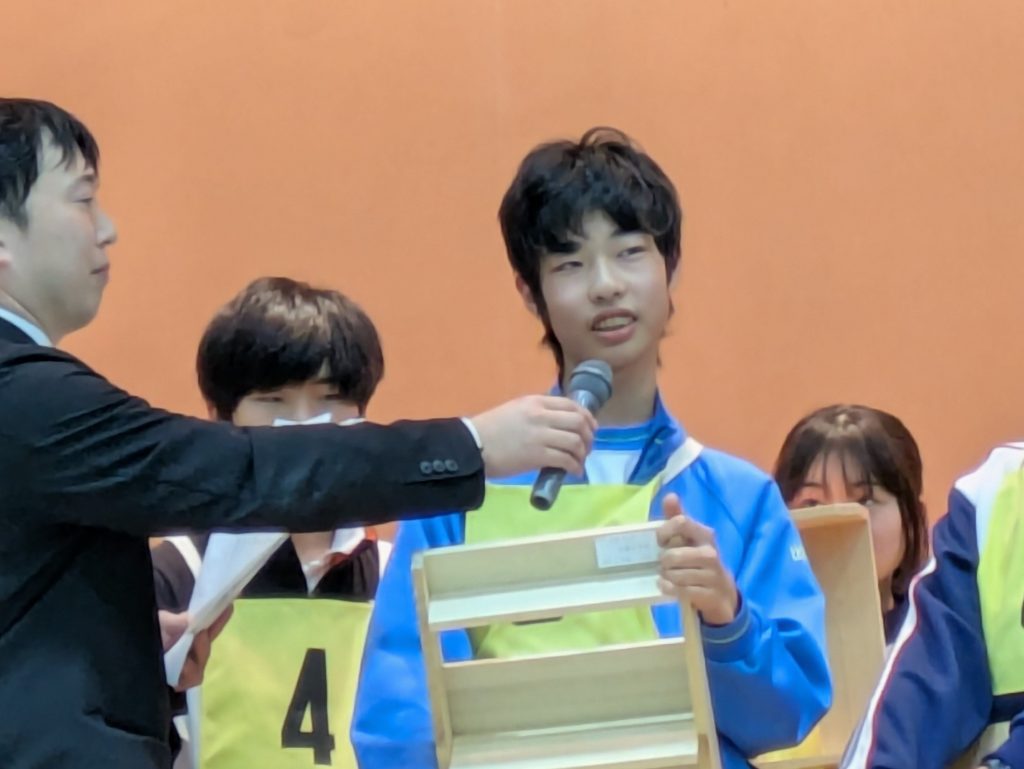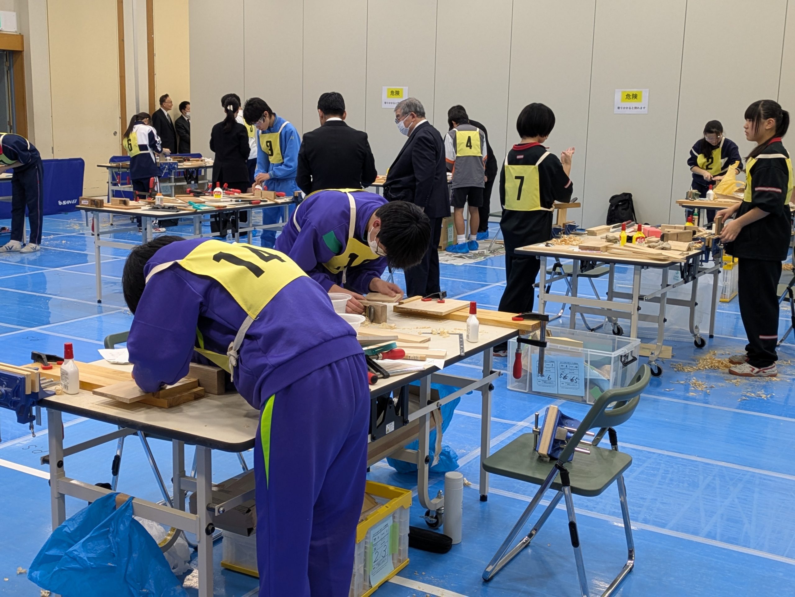 健康体育室の会場では、中学校の技術・家庭科で学習した知識や技能を活かし、その成果を競うコンテストが行われました。「木工部門」と「ソーイング部門」の2部門に分かれ、各校から選ばれた選手達が、日頃の成果を競いました。