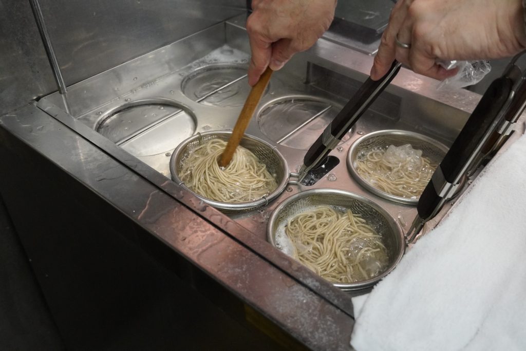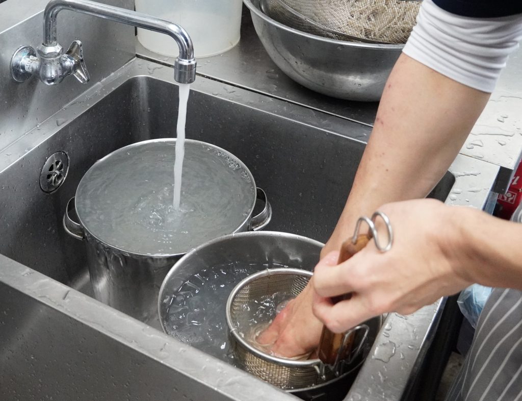 茹であがった麺はすぐに冷水へ。