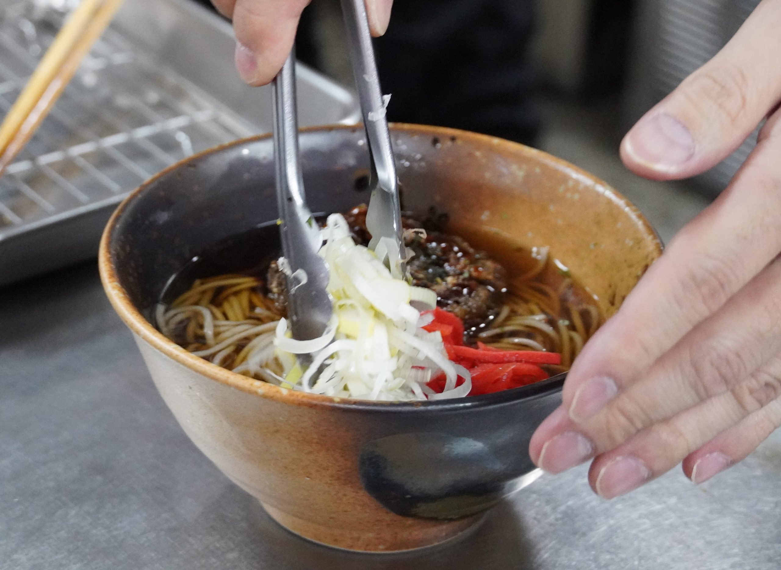 盛り付け前に麺を10秒ほど温め直します。